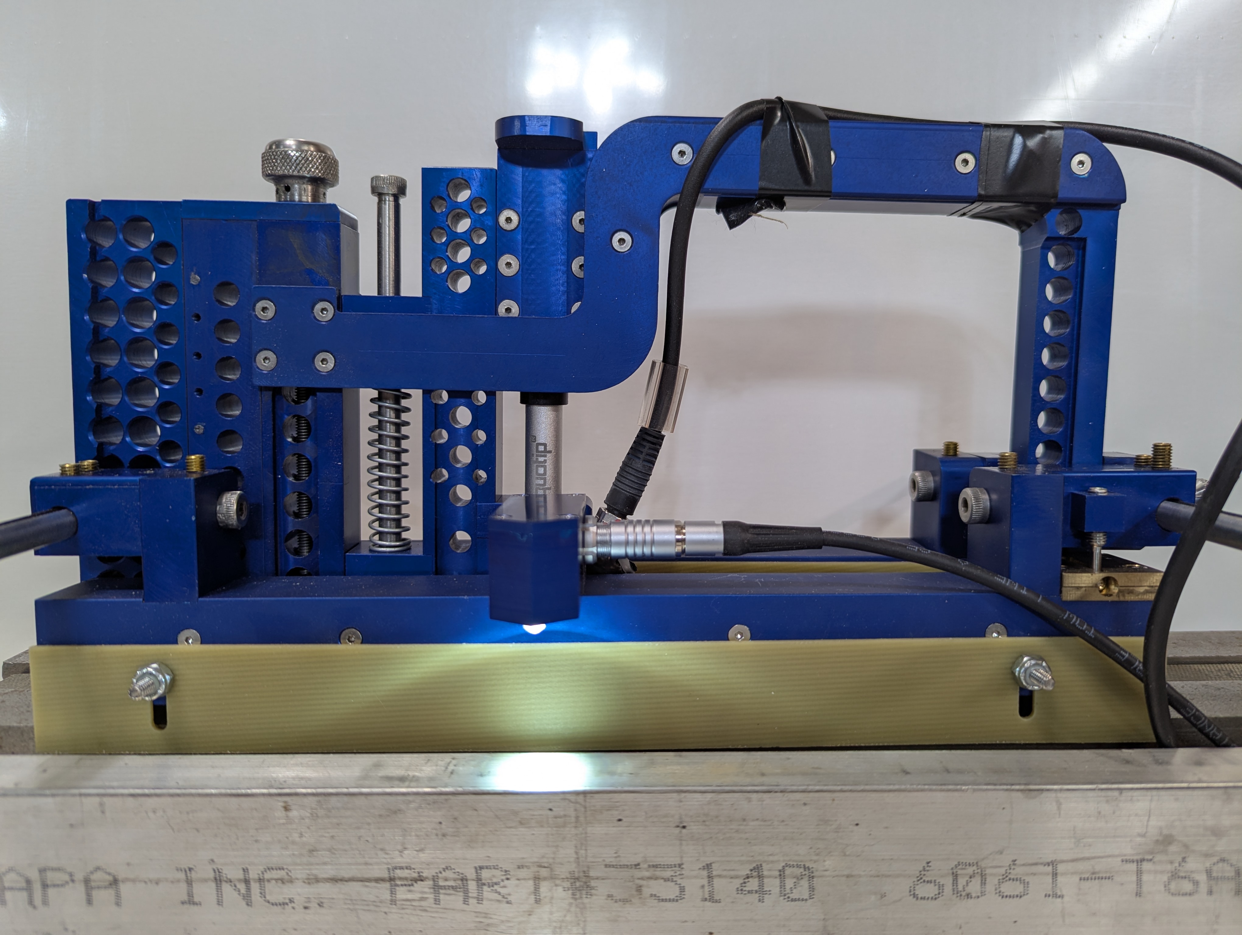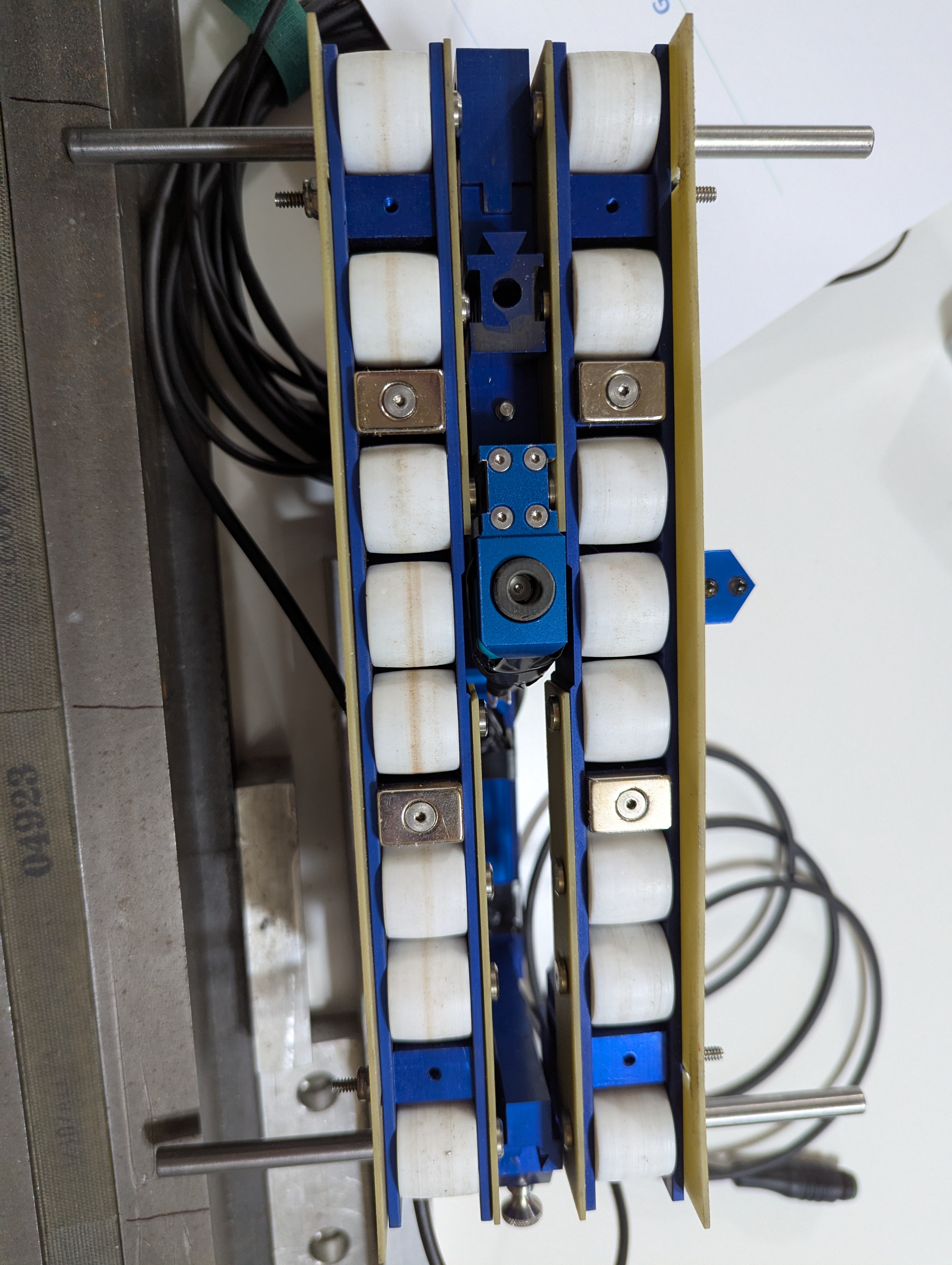 The trolley is 10.5" in length and has of 2 rails. Each rail consists of 8 teflon wheels. Each wheel is mounted on the shaft and it rotates on 2 miniature ball bearings (32 bearings in total). There are 4 magnets that are mounted on each rail. These are Neodymium rare earth magnets N52 with a pulling strength of 16.8 lbs. The Equotip D hammer is mounted between the rails and is adjustable to suit most generator designs since the wedge depth from the surface of the iron to the top of the wedge is different from generator to generator. This unique design was developed by RPGS Inc. through it's extensive generator experience.