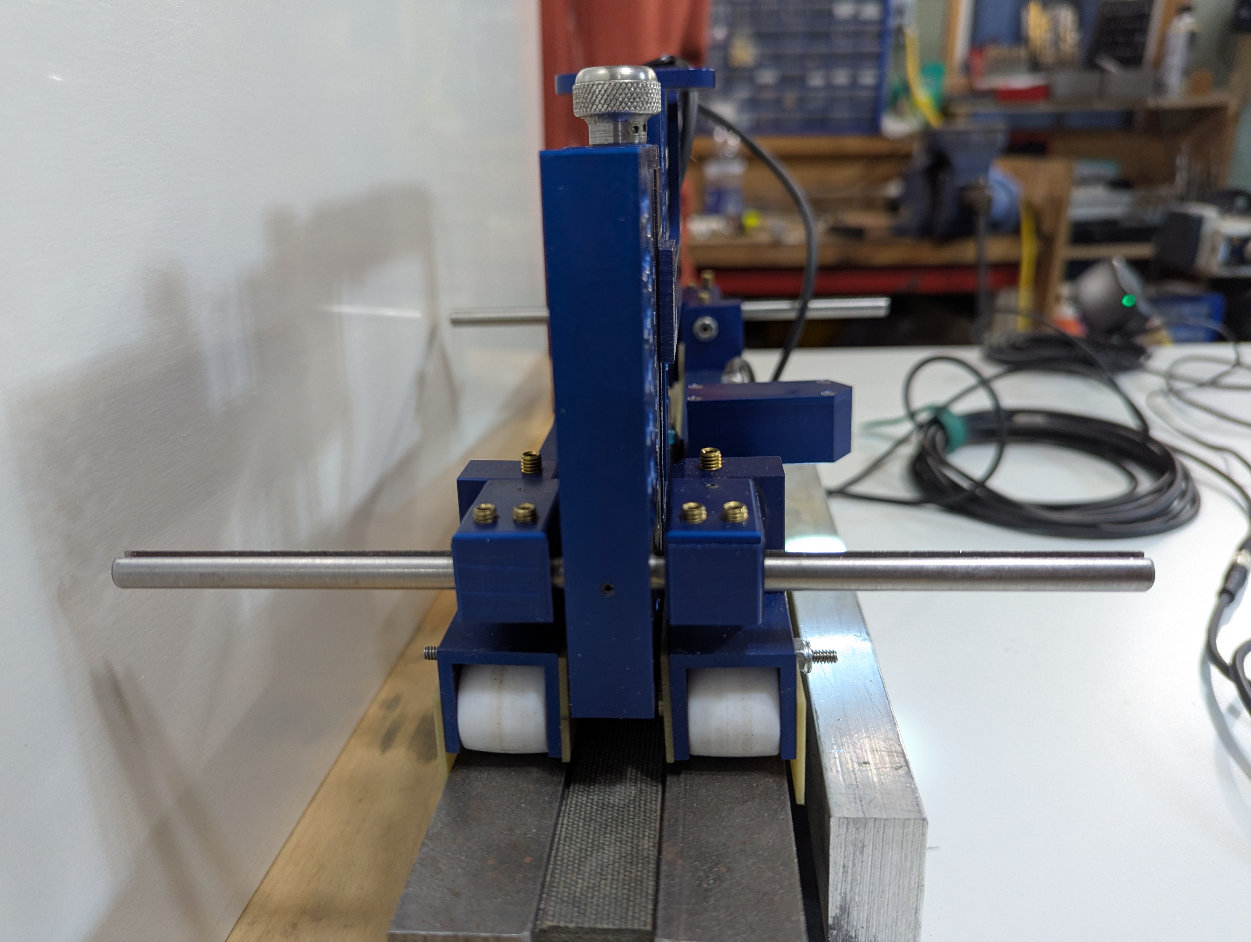 To make the job much easier, less stressful and much more comfortable on the body, RPGS Inc. designed a Wedge Trolley. The trolley is on wheels and held in place to the core with 8 strong rear earth magnets. After the trolley is set to the core slot, it is handled with one hand and the other hand is free to support the body in the most comfortable position possible. If for any reason you have to stop tapping (coffee breaks, lunch or toilet needs), you can leave trolley in position on the wedge that you last tapped. When you return, you can continue tapping from where you left off. This will be way easier on the knees and the back of the craftsmen that is performing the wedge tightness tapping test. The hammer ("D" device) that is mounted on the trolley will always be able to take the data at the right angle to the wedge resulting in a very accurate measurement.